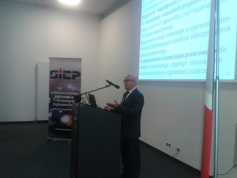 Mariusz Sobecki – Członek Prezydium Zarządu Głównego SITP, rzeczoznawca ds. zabezpieczeń przeciwpożarowych, zaprezentował techniczne aspekty scenariuszy pożarowych i ich wpływ na praktyczne zastosowanie. Z jego, bardzo ciekawego wystąpienia, wynika kilka tez, z których najważniejsze to konieczność „skrojenia” scenariusza pożarowego na miarę każdego, rożnego od innych obiektu, skoordynowanie prac nad scenariuszem przez projektantów wszystkich branż pod nadzorem rzeczoznawcy ds. zabezpieczeń przeciwpożarowych a także również to, że dla większych obiektów centrala sygnalizacji pożaru nie jest w stanie zapewnić niezawodnego monitoringu i sterowań bardzo wielu elementów. Konieczne jest wówczas stosowanie systemów integracji urządzeń przeciwpożarowych.
